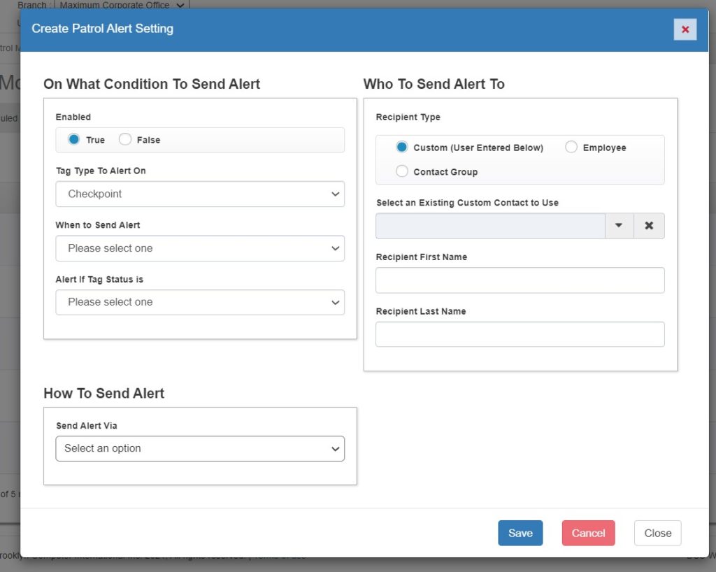 SETUP->SETTING->PATROL MONITORING SETTINGS->PATROL ALERT SETTING TAB->CREATE BUTTON->FILL ALL THE MANDATORY FIELD ->SAVE