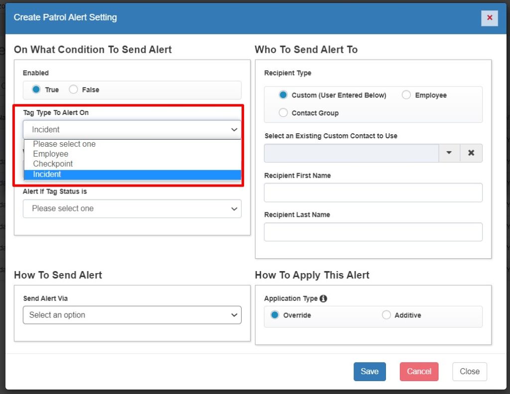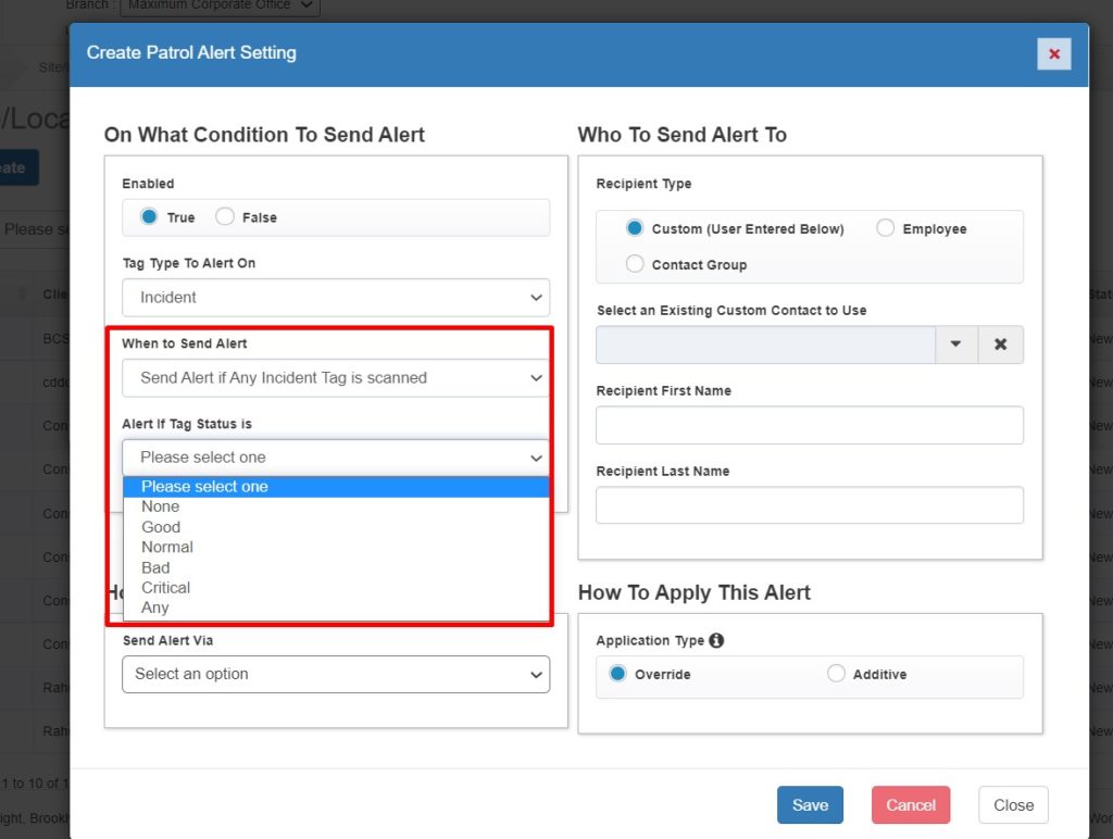Incident tag type is set alert with two option one when any incident tag is scanned and one with specific incident tag is scanned with the status such as “Good,Normal,Bad,None,etc”