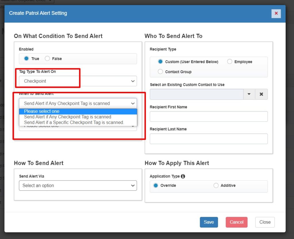 At the location level admin can set three types of tag type to alert on “Checkpoint,employee & Incident”.