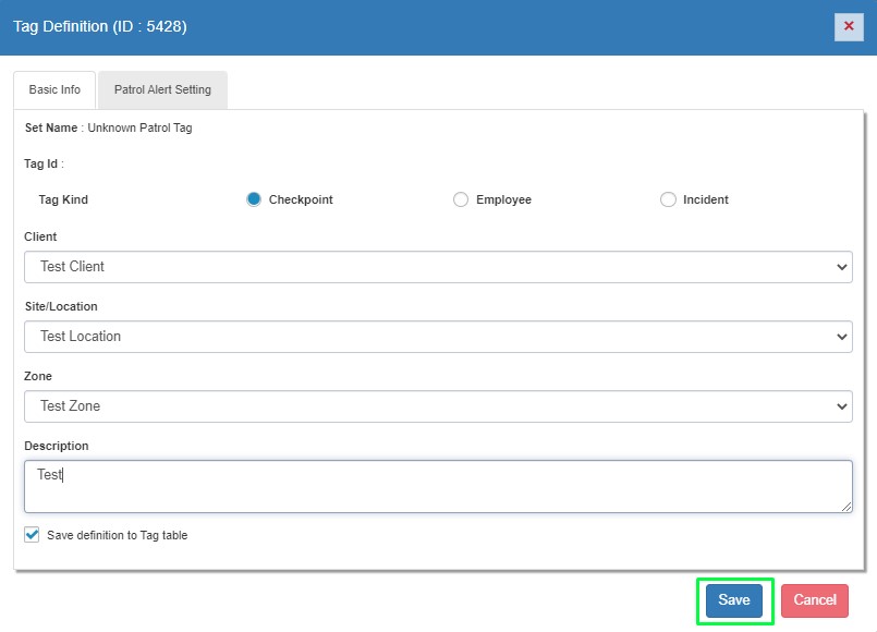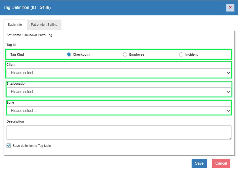Step 4: Edit page will open. Select the tag type like Checkpoint, Employee or Incident. Select Client, Site/Location and Zone for the tag. User can also add description for the tag.