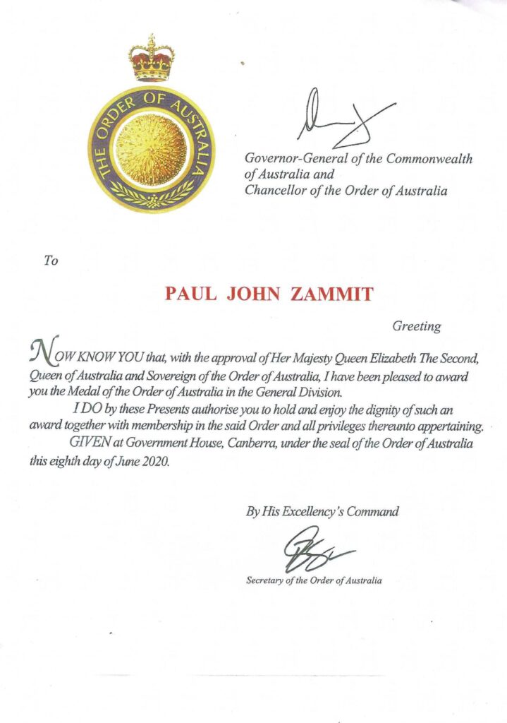 8th June 2020 Investiture at Government House Sydney, Paul Zammit OAM FAICD on the awarding of the Medal of the Order of Australia (OAM) in the General Division by the Governor of New South Wales, Her Excellency the Hon. Margaret Beazley AC QC