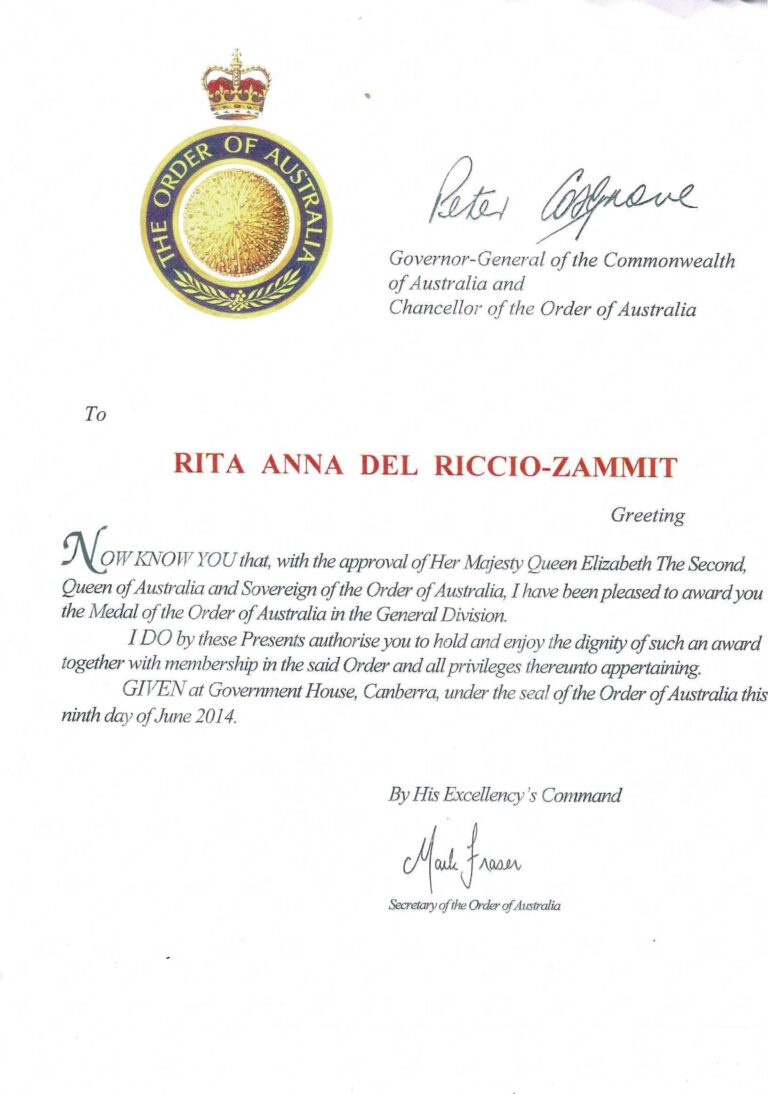 9th June 2014 Investiture at Government House Sydney, Rita Zammit OAM on the awarding of the Medal of the Order of Australia (OAM) in the General Division by the Governor of New South Wales, Her Excellency Professor Dame Marie Bashir AD CVO