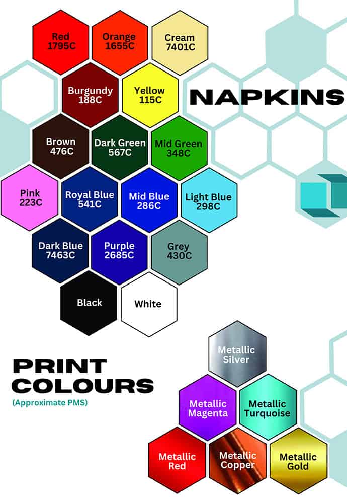 Choice of Napkin colour: *Please note that pricing for white and coloured napkins differs slightly Cocktail: White / Black / Cream / Red / Burgundy / Dark Blue Dinner: White / Black / Cream / Red / Burgundy / Sky Blue / Dark Blue / Mid Grey Cutlery Pouch: White / Black / Cream
